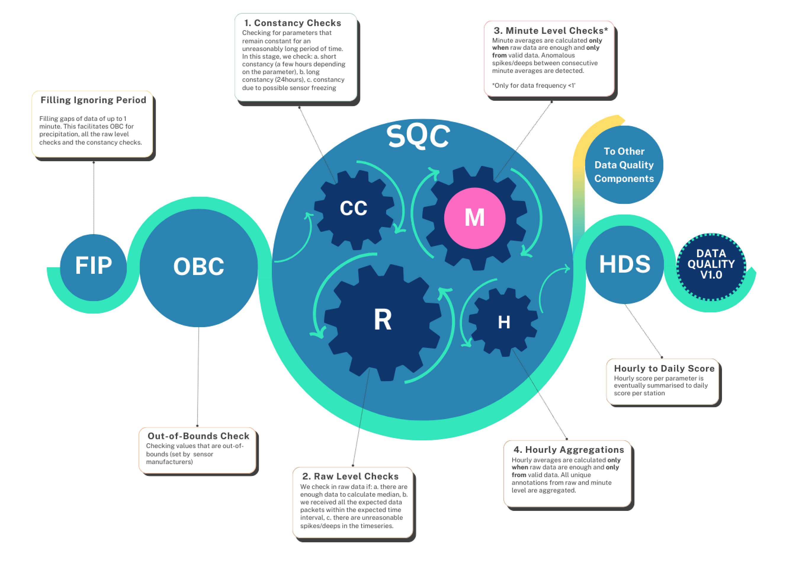 SQC is the process that identifies unexpected behaviour in the measured parameters, which could be attributed to a defective sensor or an improper station deployment. It should be noted that OBC is included in SQC as the first step of this process. The final result of this process is the annotation of the data in 3 levels: